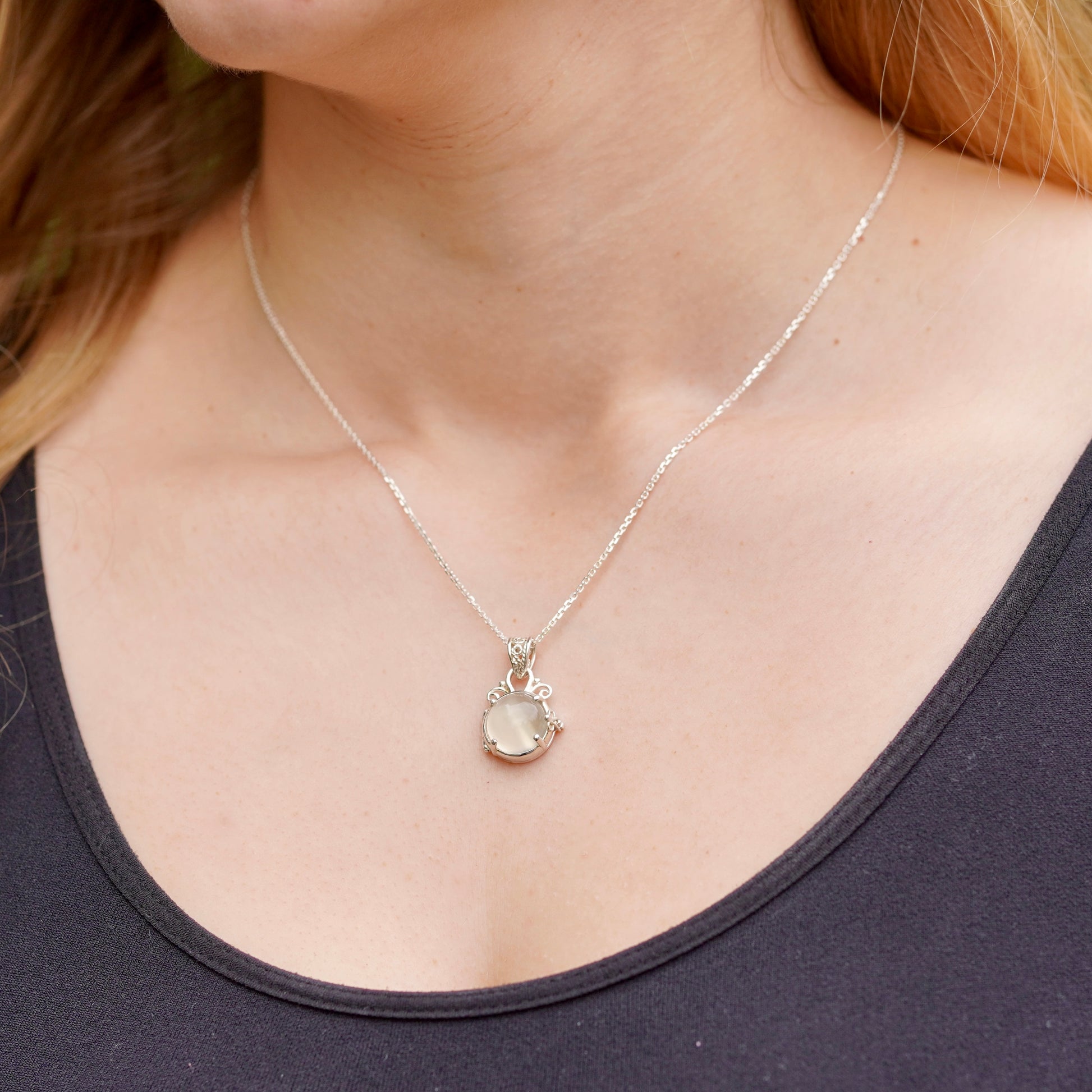 Intricate swirls of argentium silver filigree flow around a luminious, vintage (old stock) moonstone in elegant patterns. As you move it the light dances across the cats-eye affect in the stone and glows through the openwork filigree at the back. Looking at the side you see a tiny latch that allows the filigree back to swing open and allows a spot for a small keepsake like a dried petal from a bouquet or a tiny photo. This stunning, museum quality locket is one of a kind and entirely hand fabricated in every detail.