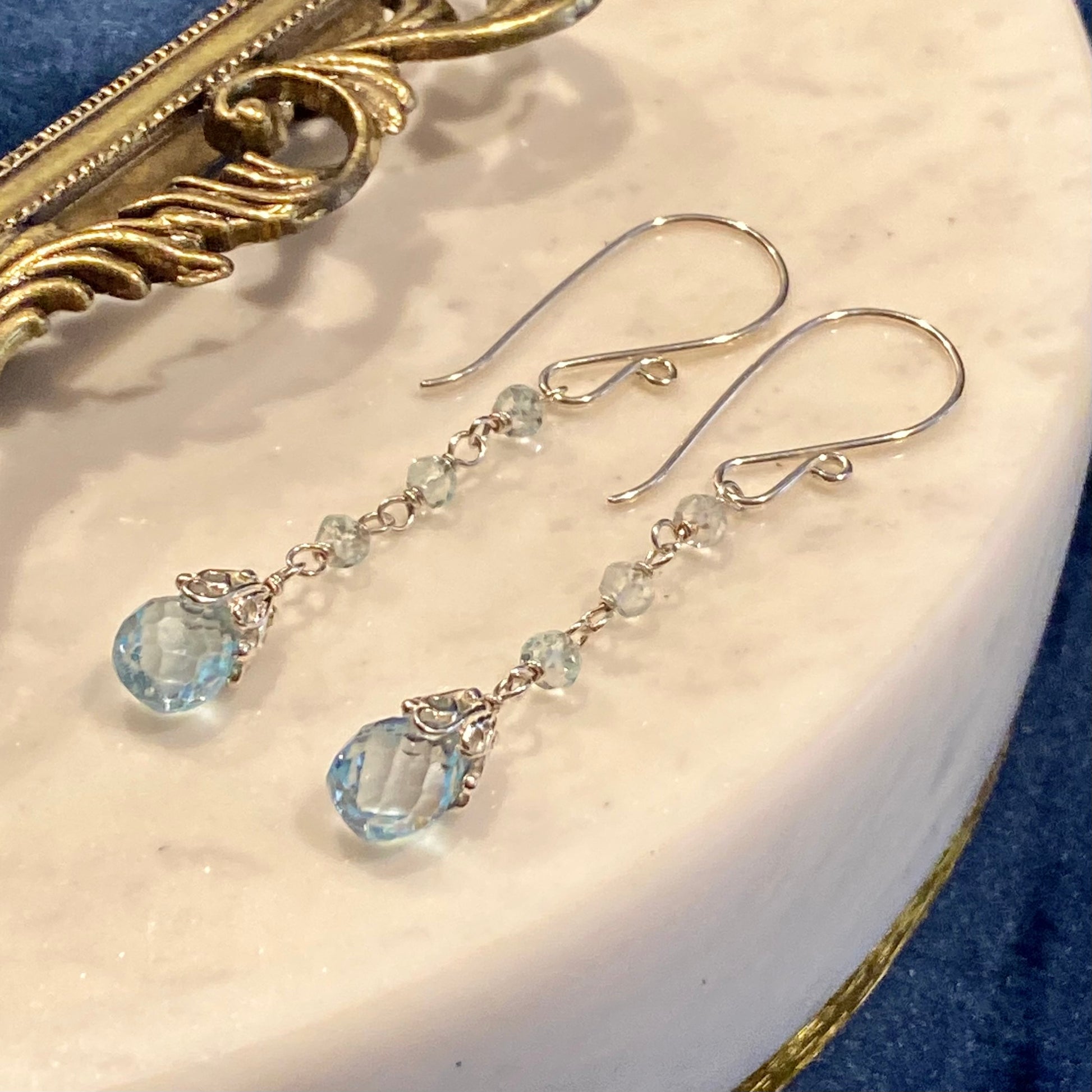 Elegant and entirely hand-fabricated these dangly earrings are lightweight and stunning on their own or perfect for a special occasion with these one-of-a-kind, vintage topaz droplets topped with filigree swirls, dangling from faceted old stock aquamarines. Made in Argentium Sterling silver